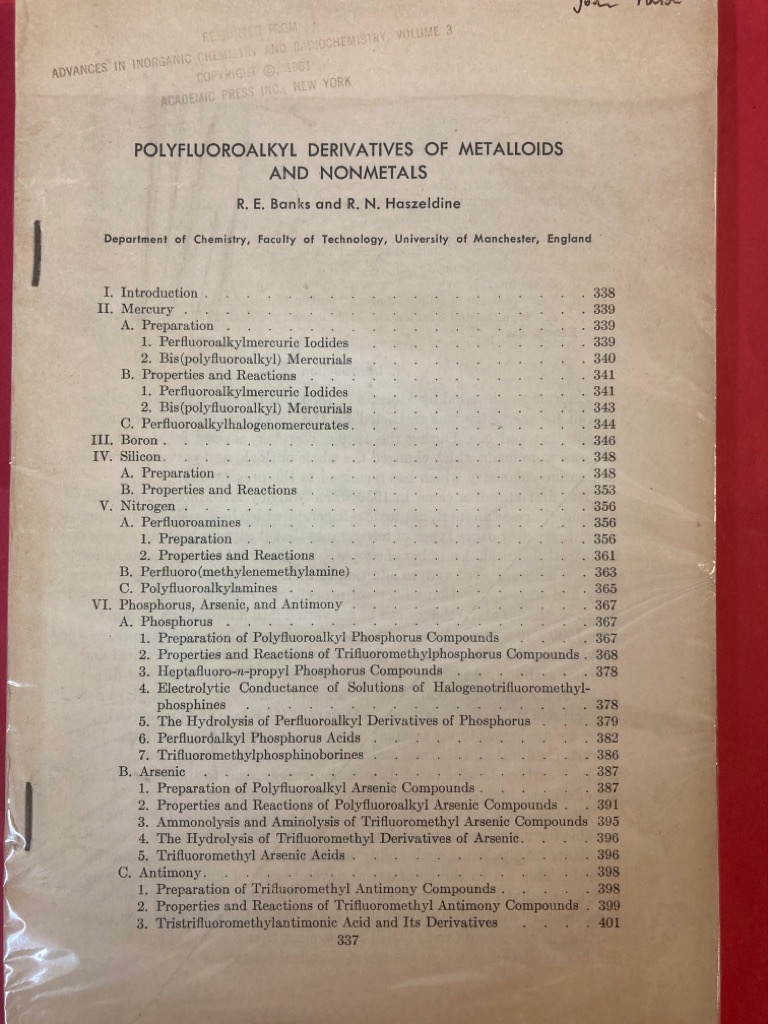 Description: approx 100p offprint, stapled, very good, topgether with a related offprint by W R Cullen entitled: Fluoroalclic Derivatives of Metals and Metalloids (50p)