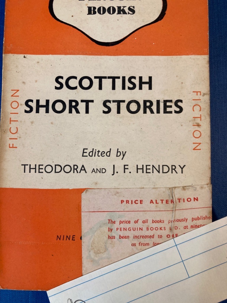 Description: This is a copy of Scottish Short Stories edited by T & J F Hendry with a somewhat creased price alteration label covering the original price on the cover, together with a second title displaying a similar label