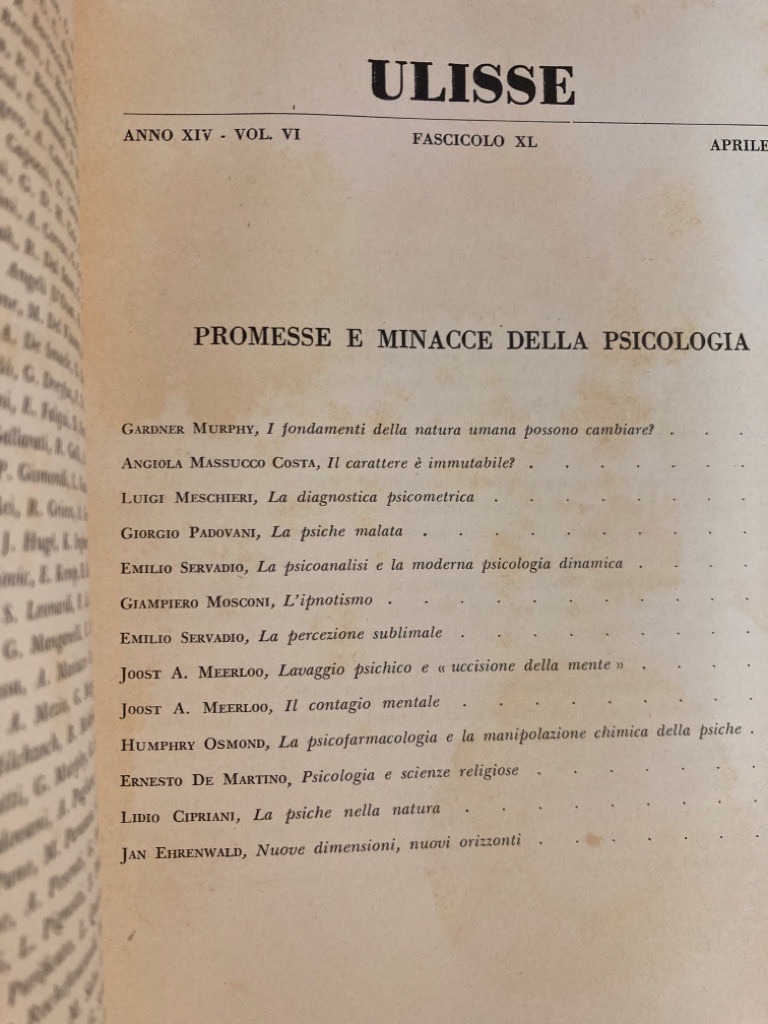 Description: 100p large format paperback, yellow cover, collection of essays, special issue of "I Problemi di Ulisse", essays by Murphy, Costa, Meschieri, Padovani, Servadio, Mosconi, Meerloo, Osmond, de Martino, Cipriani etc