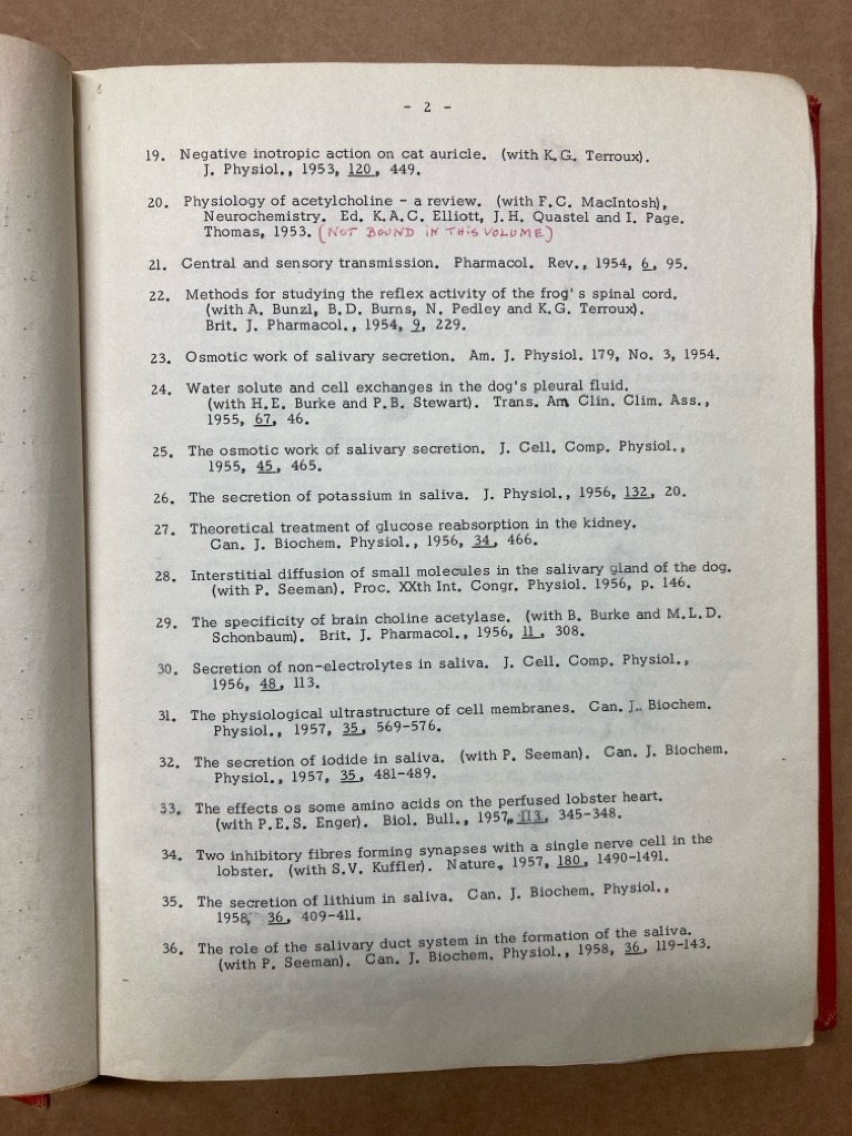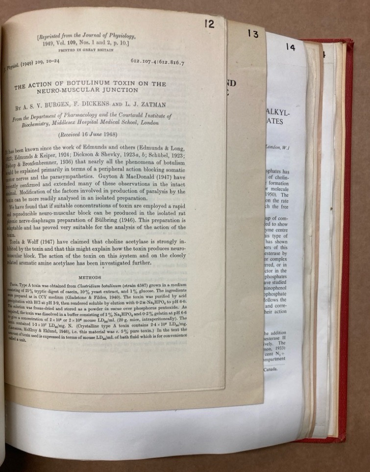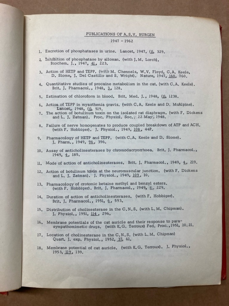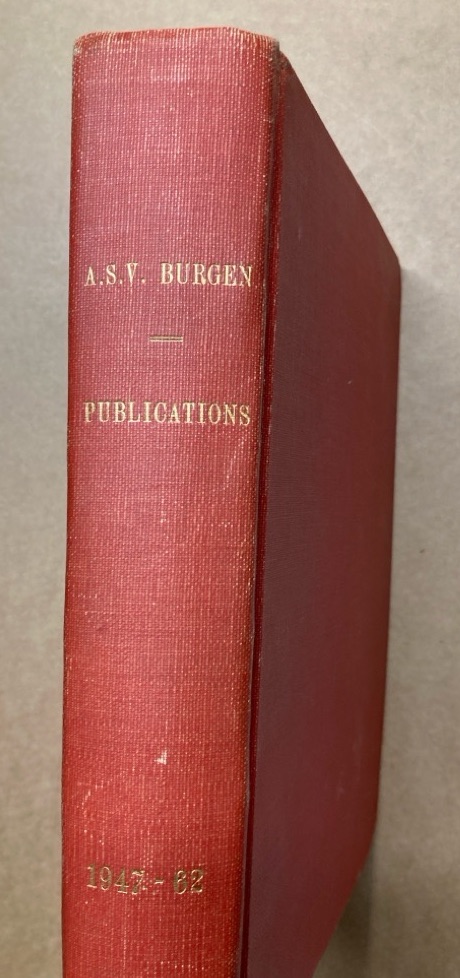 Description: 300?p large format hardback, red cloth with gilt lettering to spine, bound collection of fifty separate offprint booklets, all in good condition, light wear and marks to a few, text clear and legible, one published offprint is omitted but otherwise a comprehensive collection; this is a unique volume from the bookshelf of its author, the noted Cambridge academic Sir Arnold Burgen, and includes numerous rare offprints