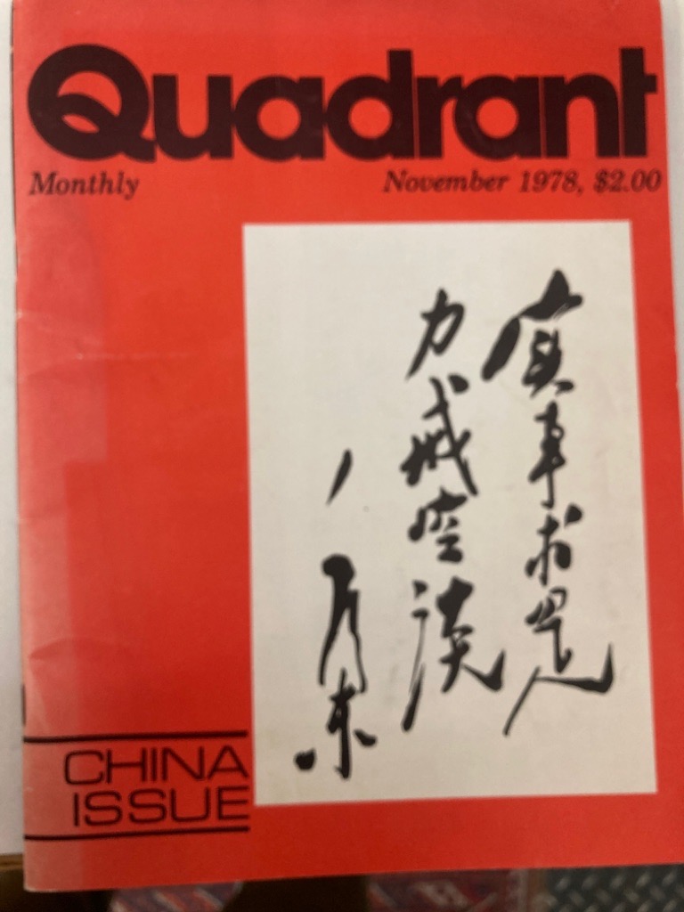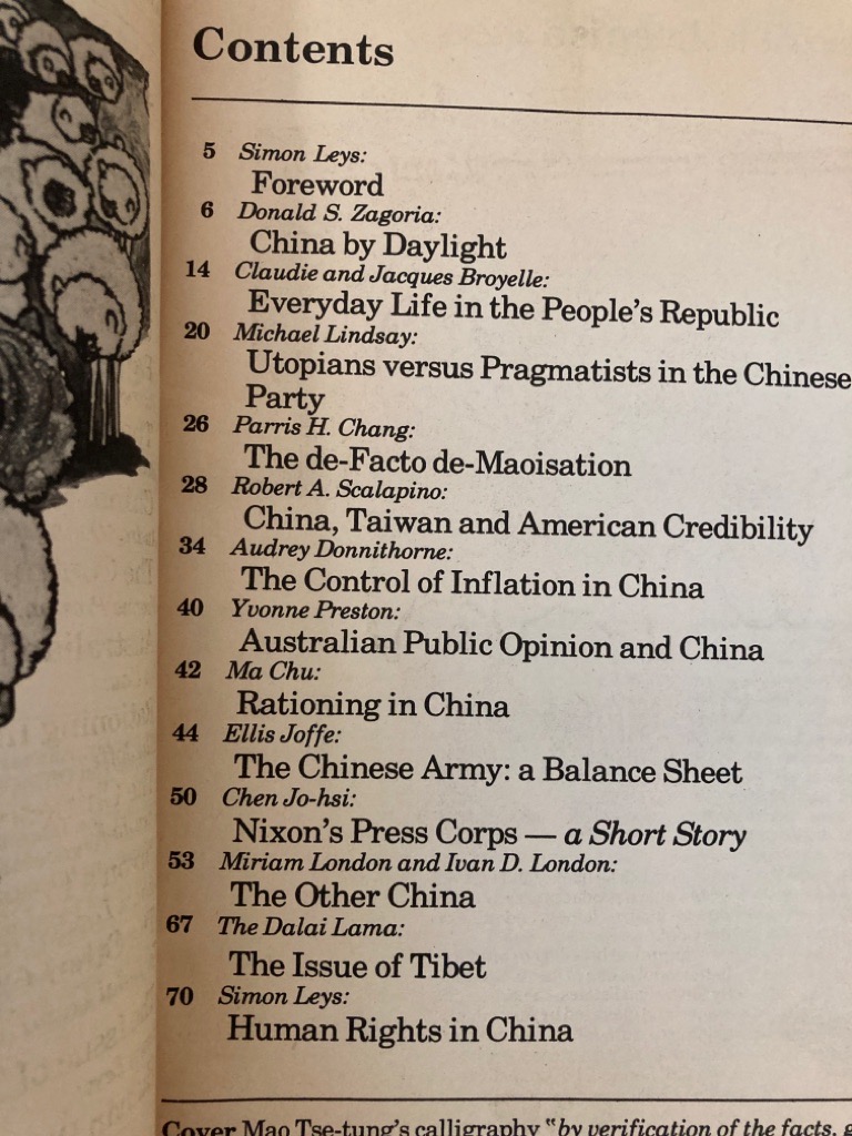 Description: 80p stapled magazine, large format, red cover, text in two columns, paper yellowing a little, very well preserved includes essays Zagoria (China by Daylight), Broyelle (Everyday Life), Lindsay (Utopians vs Pragmatists), Scalapino (Taiwan and American Credibility), Joffe (The Army), London (The Other China), Dalai Lama (Tibet), etc