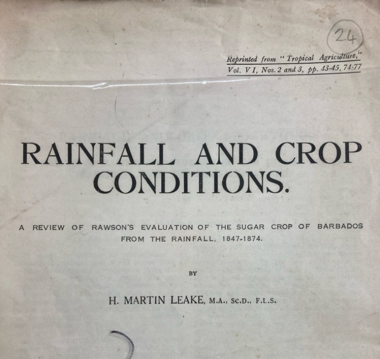 Rainfall and Crop Condition. A Review of Rawson\'s Evaluation of the Sugar Crop of Barbados from the Rainfall, 1847 - 1874.