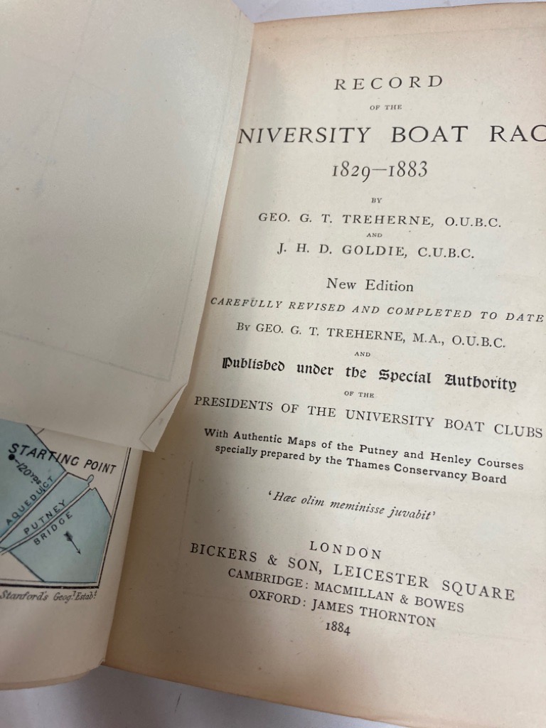 Description: xvi 288p green cloth with gilt lettering and university arms to cover, corners worn, weak inner and outer hinges, notes, tables, odes, folding map frontispiece well folded: 'with authentic Maps of the Putney and Henley Courses specially prepared by the Thames Conservancy Board', pages clean, binding a bit soft, very clean, with adverts and engraved armorial bookplate Richard Liddon Meade-King