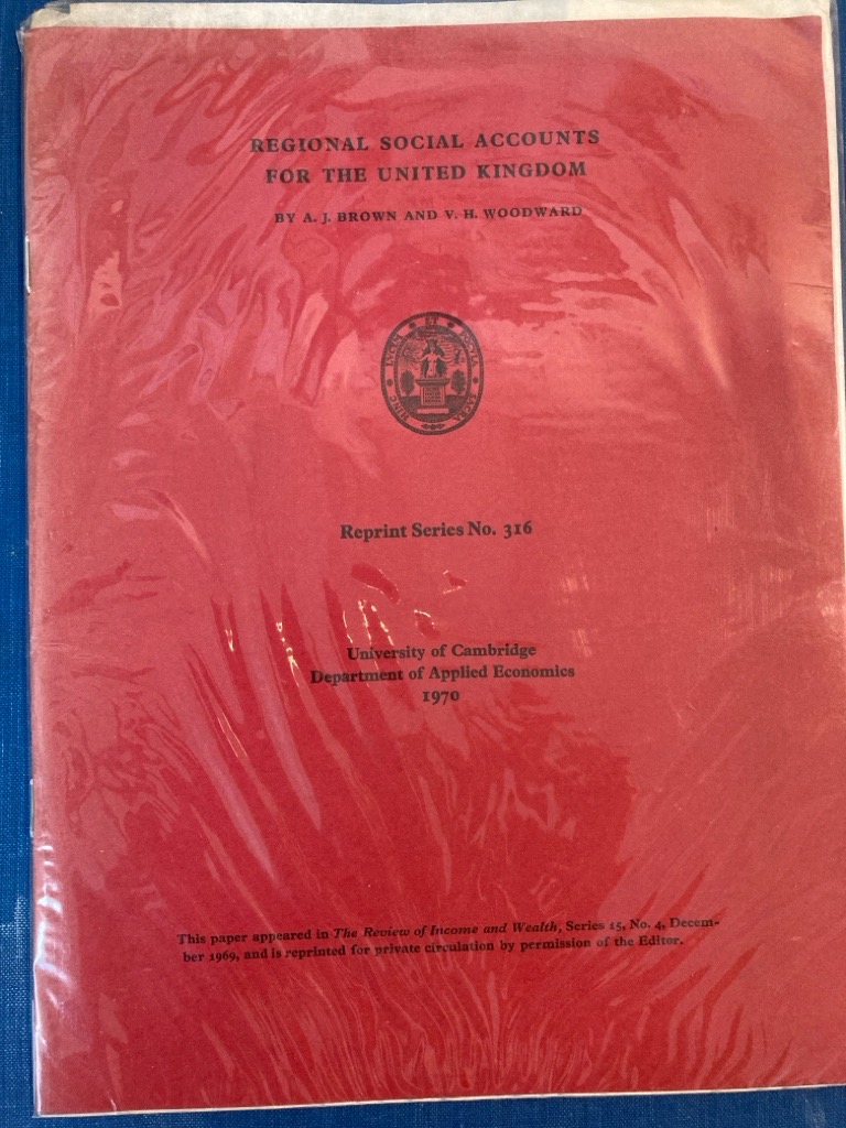 Description: Unpaginated large stapled offprint with red card cover, top corner a little folded but pages clean and unmarked, author's own copy, paper originally published in The Review of Income and Wealth, Series 15, No 4, December 1969