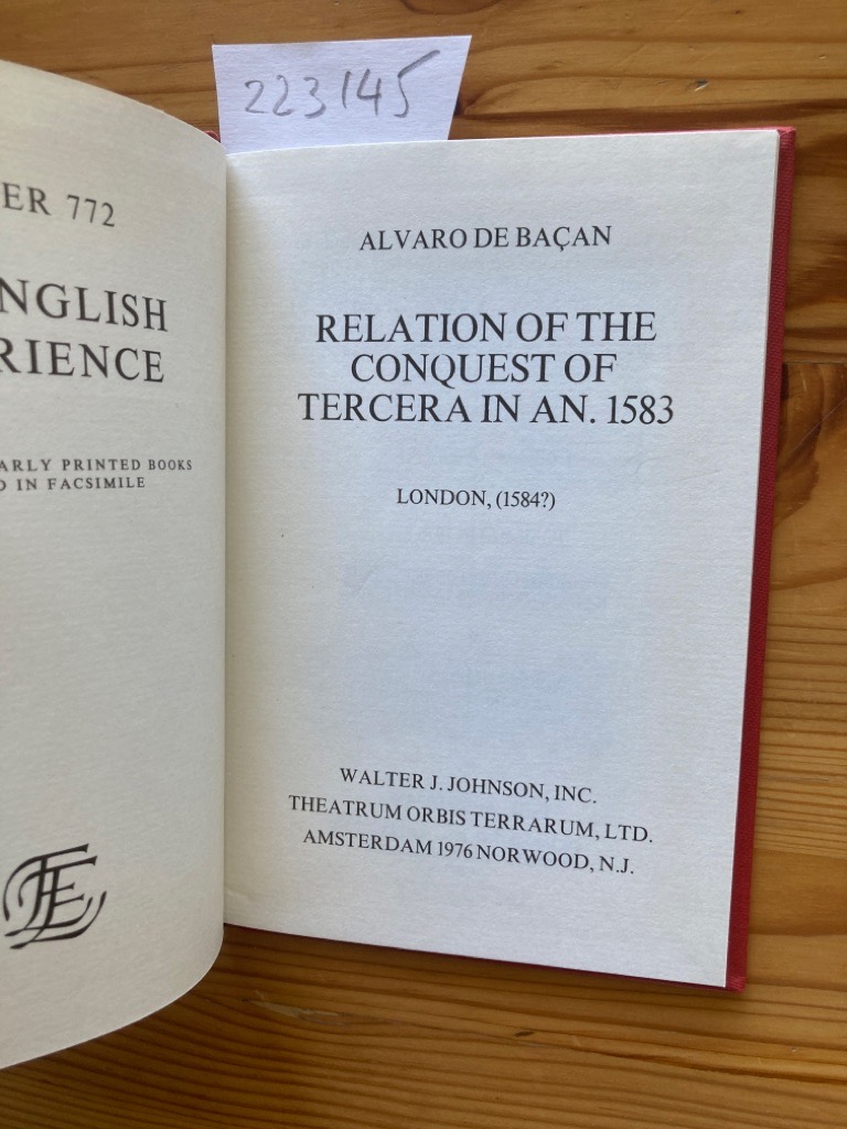 Description: 64?p small format hardback, red cloth with dark title label to front, light library markings, a very good clean copy of the reprint of the edition of 1583(?), author also spelled Alvaro de Bazan