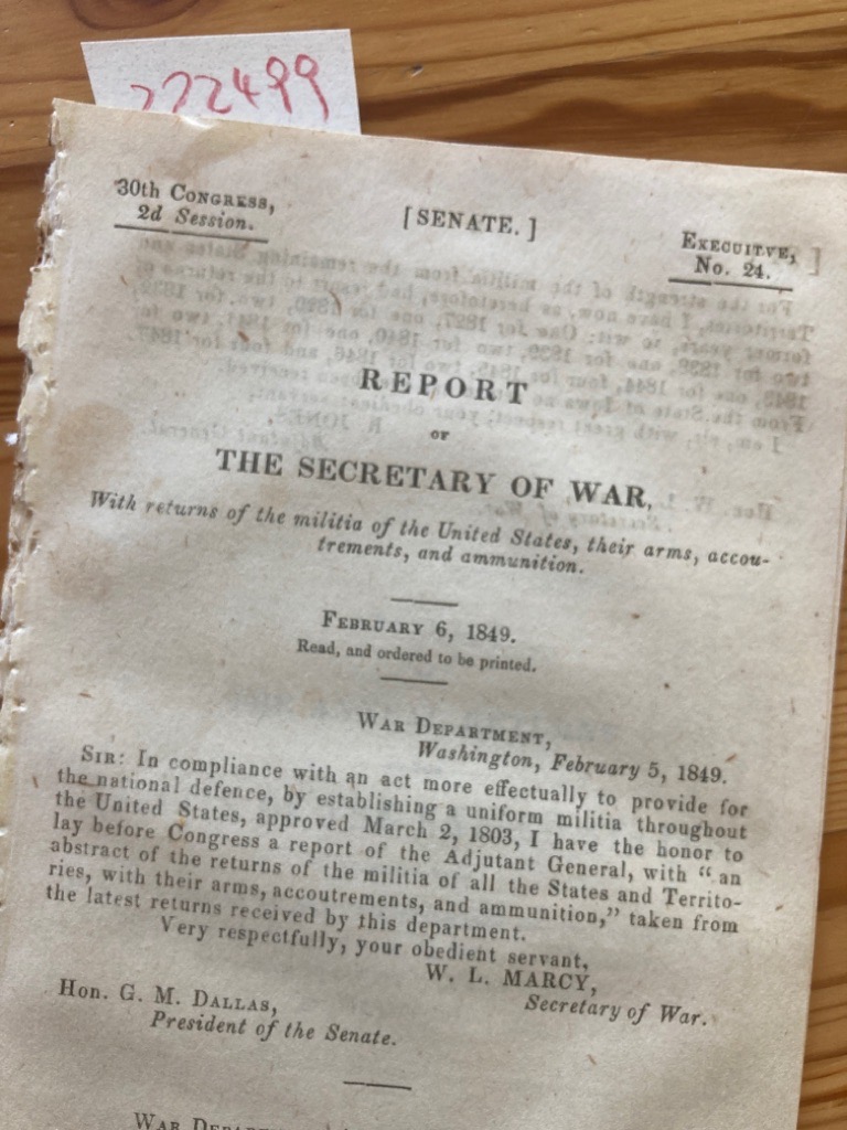 Description: 17p removed from binding, original print, binding a little fragile but still holding, without cover, this item could easily be inserted in a new binding, = 30th Congress, 2nd Session, Senate, Document 24, clean copy, contains mostly of tables which outline the state of the Militia for the year 1848