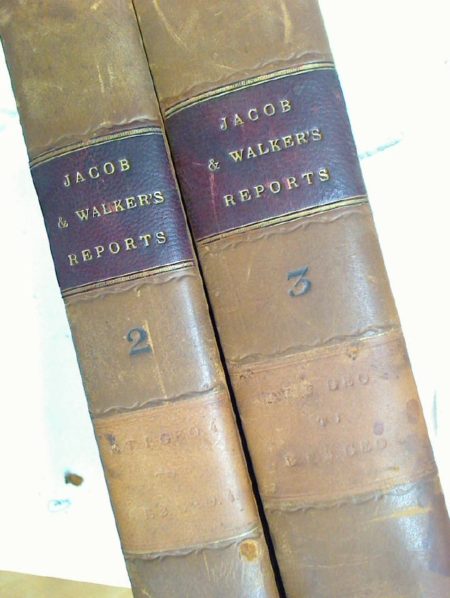 Description: 596p; xii, vi, vi 662p two volumes in full calf, title label to spine "Jacob & Walker's Reports", nice and well preserved set, the title page for the 1823 volume states "Volume 2", probably missing an earlier volume, but complete for the period indicated