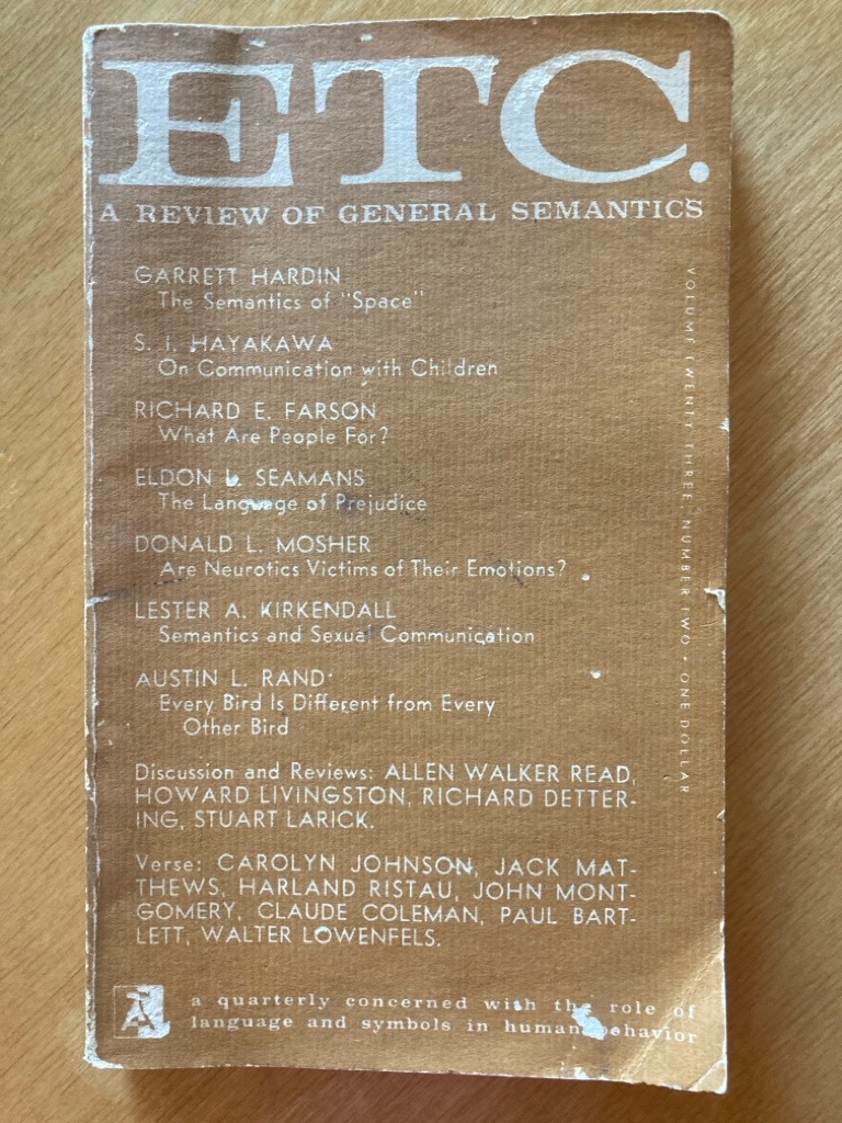 Description: 128?p brown card cover, paperback format, fresh copy, cover a little aged and rubbed no names or stamps, still very good, essays by Hardin (Semantics of Space), Hayakawa (Children), Farson (What are People for), Seamans (Langauge of Prejudice), Rand (Every Bird is Different from every other Bird), etc