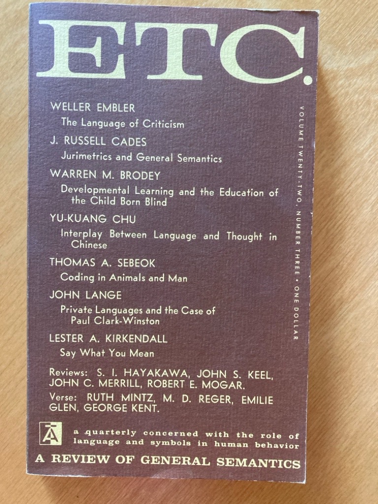 Description: 128?p brown card cover, paperback format, nice fresh copy, no names or stamps, very good, Embler on Criticism, Cades on Jurimetrics, Brodey Children born Blind, Language and Thought in Chinese, Sebeok: Coding in Animals; Private Languag; Kirkendall: Say what you mean, etc
