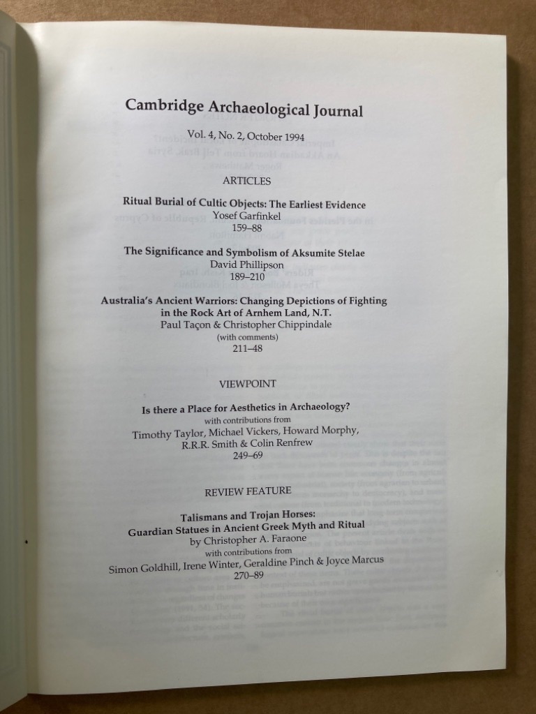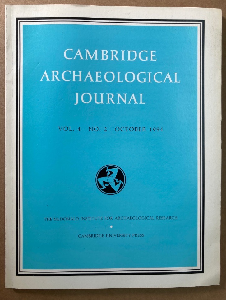 Description: 30p article, Cambridge Archaeological Journal, Volume 4, Number 2, October 1994, also including other interesting articles and reviews, large paperback with blue cover, binding firm, pages clean and neat, diagrams and illustrations, a very good copy