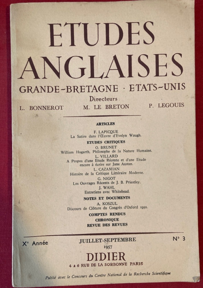 Description: this is a 20p essay in Études Anglaises, for sale is the whole issue, includes additional essays by O Brunet (Hogarth), Villard (Jane Austen), Cazamian, etc