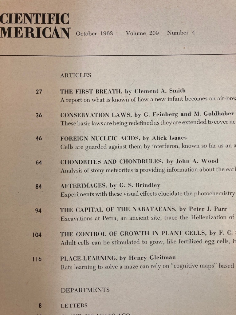 Description: 156p stapled journal, many colour illustrationsn and period adverts, essay on The First Breath, Foreign Nucleic Acids, The Control of Growth in Plant Cells, Afterimages, etc