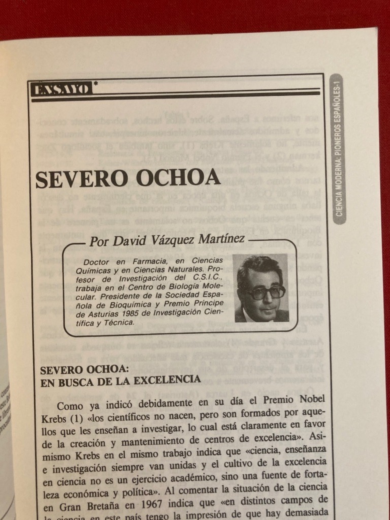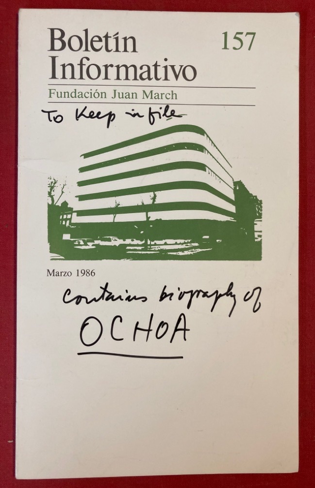Description: This is a single issue of the Buletin Informativo issued by the Fundacion Juan March with a 15p biography of Ochoa, a clean copy with black ink note to front "To Keep in File, Contains Biography of Ochoa", perhaps in Cesar Milstein's hand