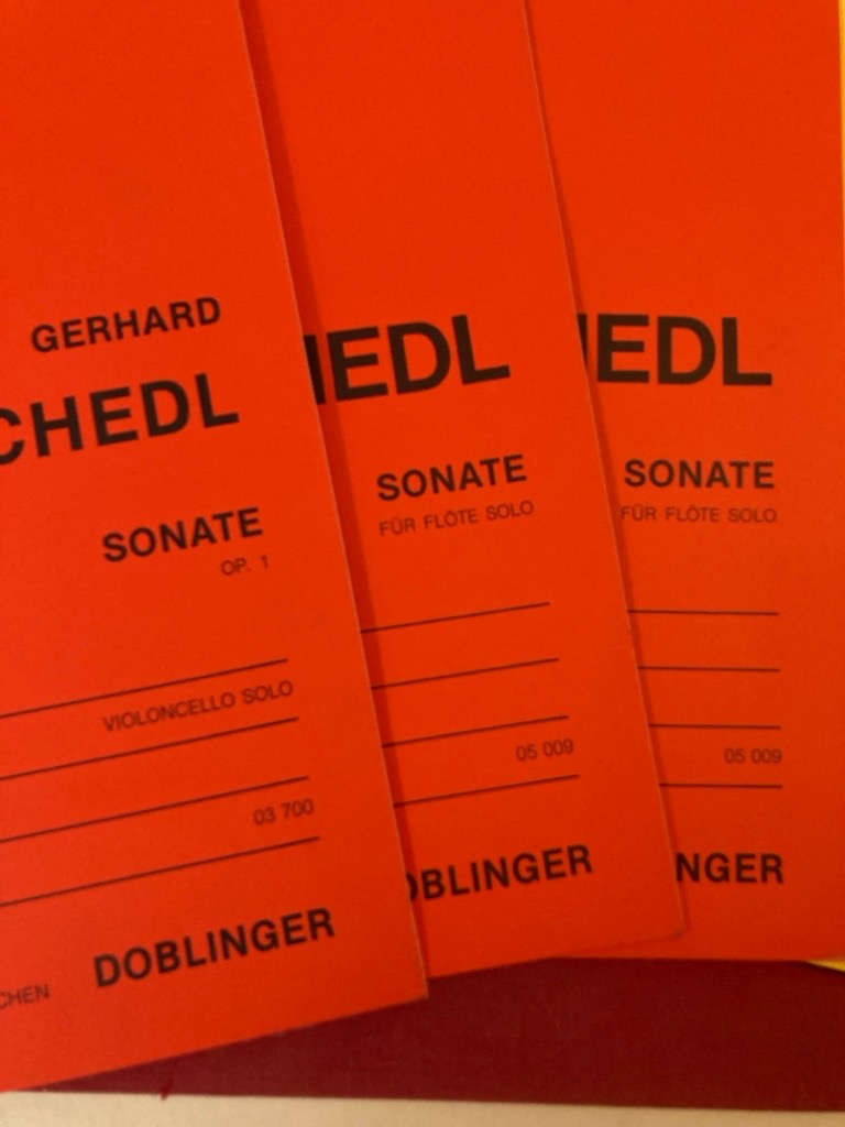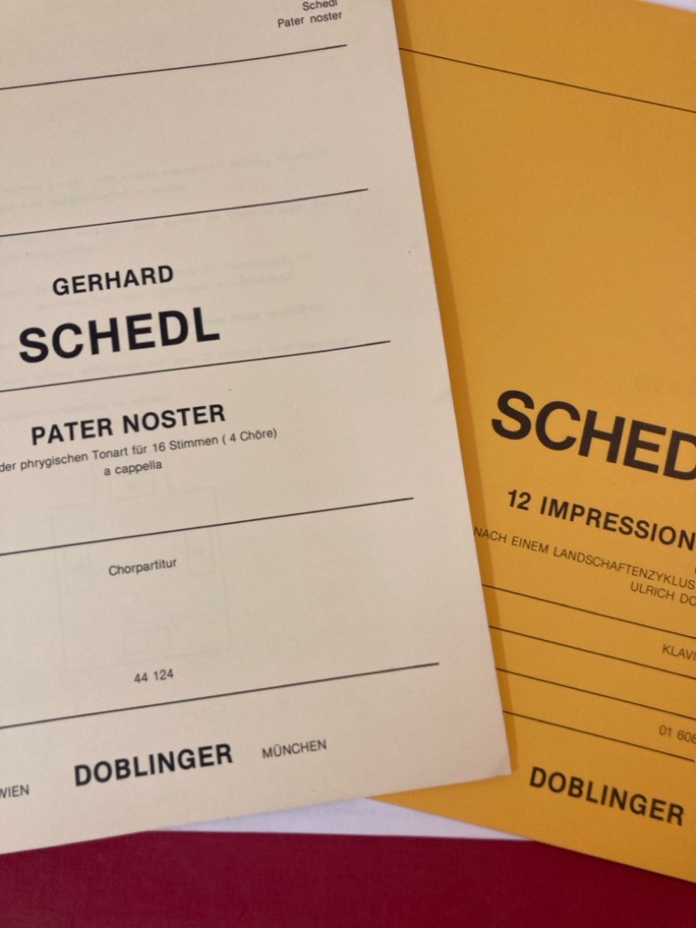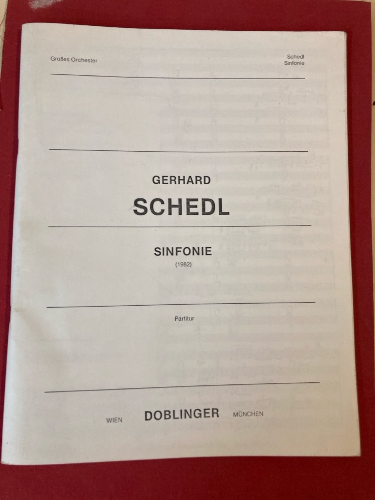 Description: 74p large format, white paper cover, the score is reproduced from MS, Schedl leaflet inserted, "Im Auftrag des Österreichischen Rundfunks", the package also includes Totentanz (Partitur), 3 Miniaturen, Sonate für Flöte (2x), Sonate Op 1, 12 Impressionen, Pater Noster (Chorpartitur), Magnificat (1982)