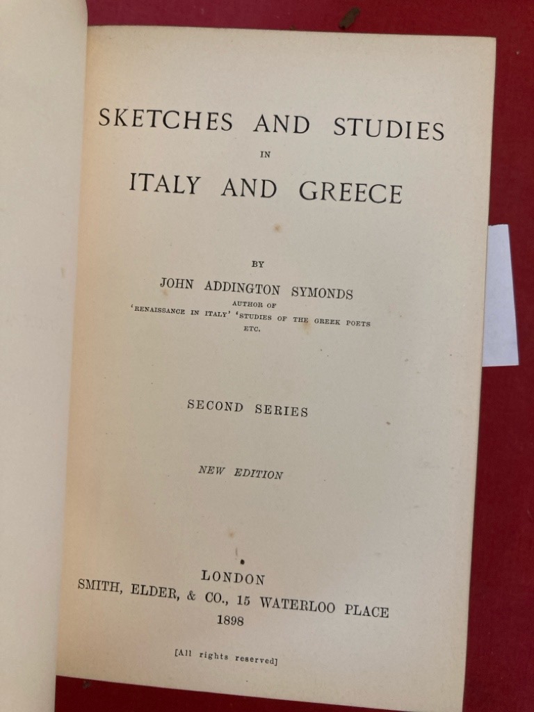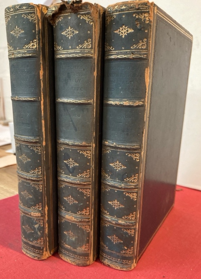 Description: three volumes in full blue calf binding (Bound by Mudie"), all edges marbled blue, marbled endpapers, loss of all title labels from spine, once a very nice and lavish binding, frontispiece to the third series, this set from the library of Walter Spindler with his name (plus one other). The set bears red ink underlining and notes to quite a few pages, adding a layer of questions and comments in a very legible hand. One spine head a little crushed, very smooth blue calf boards