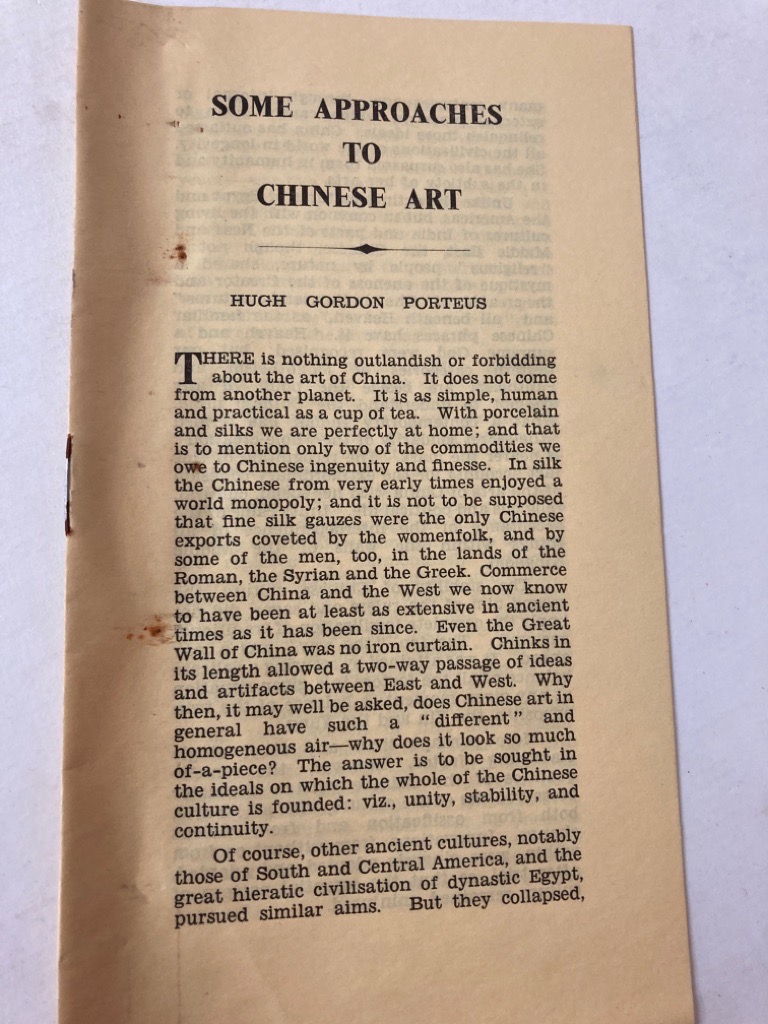 Description: 8p, slim pamphlet, stapled, yellow paper, "especially written for the exhibition on Chinese Art heal in July 1951 at the Wakefield City Art Gallery"