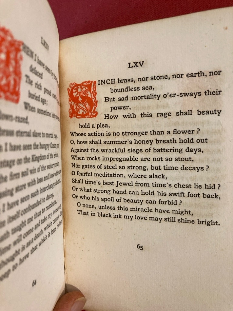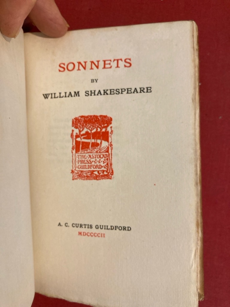 Description: 154p small format hardback with gilt lettering, vellum spine solid and a little darkened, imprint given as "A C Curtis", each sonnet with a large initial printed in red, bright paper, top edge gilt, name (Walter Spindler 1903) to prelims, frontispiece, a very attractive copy