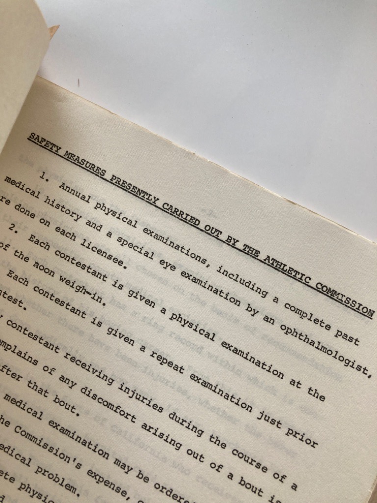 Description: 10p 9p reproduced from typescript, mimeographed, a variety of library stamps to cover, well preserved: "On March 23, 1963, Benny (Kid) Paret, the welterweight boxing champion, was fatally injured in a boxing contest held in New York", the names of committee members to page 10: Harry Falk, Jamie Smith, Dan Kilroy, Dominic Tavaglione, Douglas Hayden, attached to this item is an additional nine page report without title page with the headline "Safety Measures carried out by the Athletic Commission" and "Legislative Recommendations of this Commission". A uncommon double item