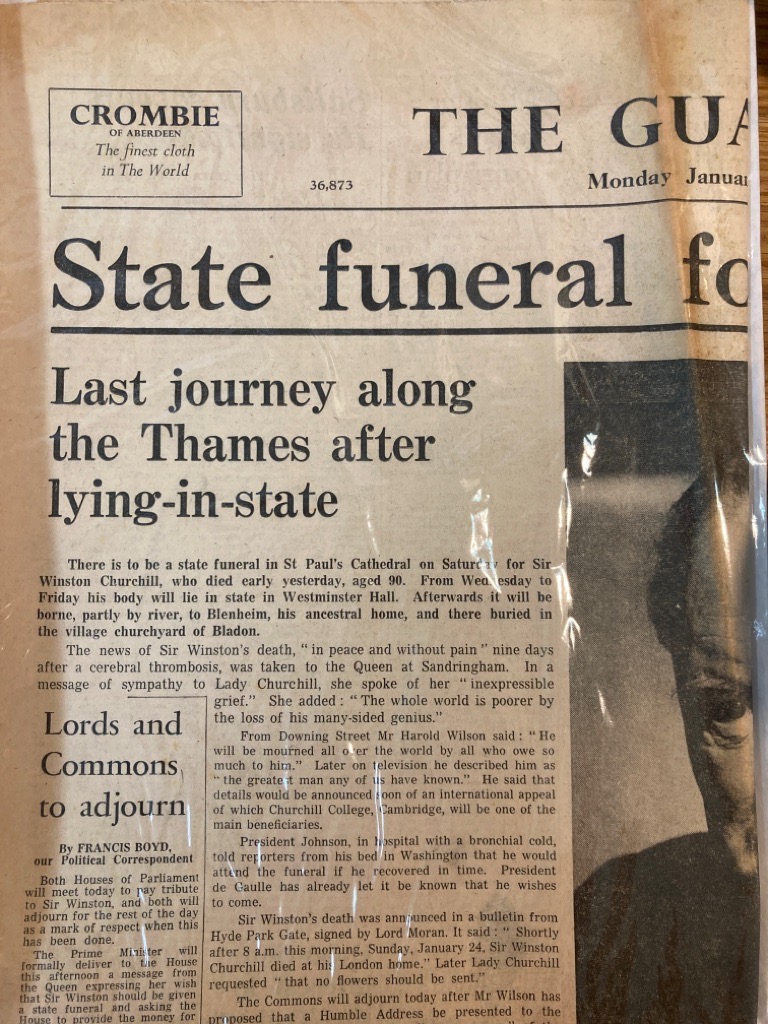 Description: 4p A2 format broadsheet front page marking the funeral plans for Sir Winstone Churchill, well preserved