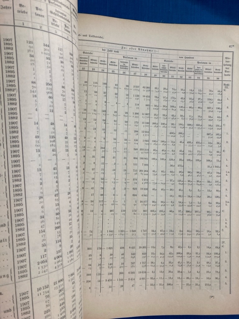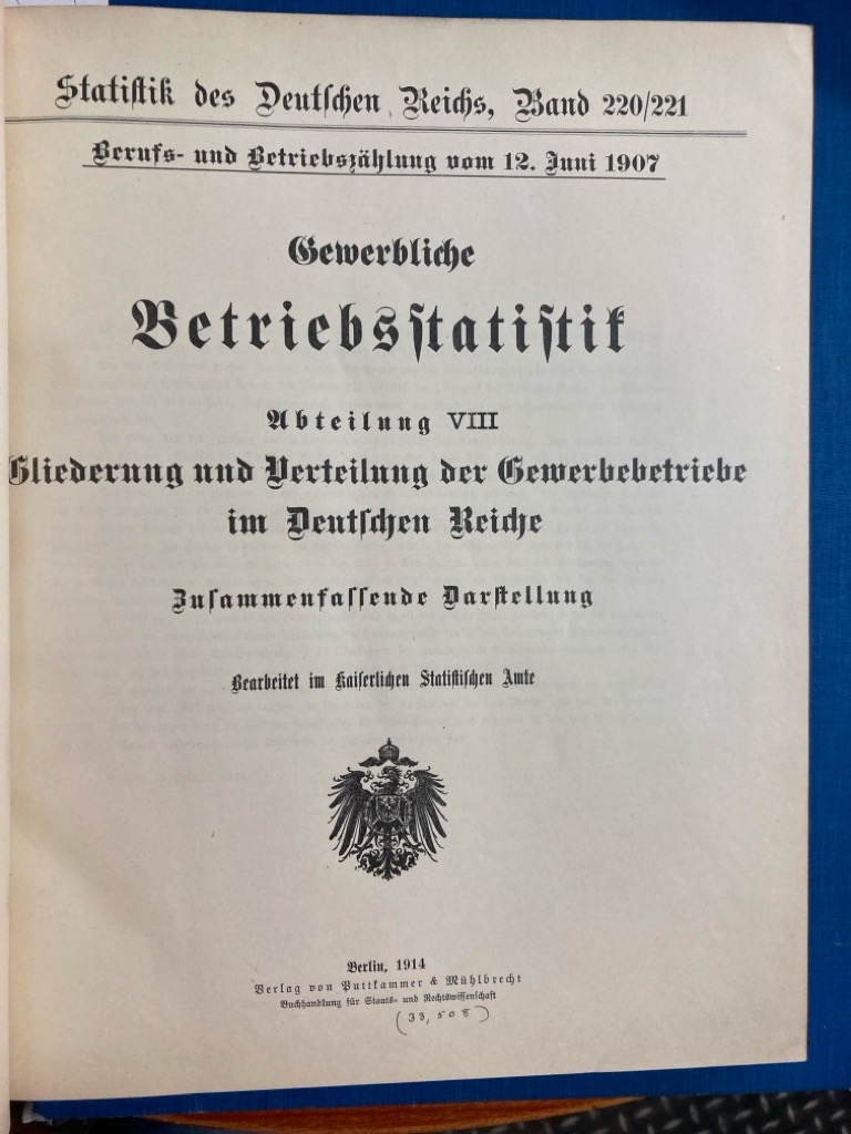 Description: 184p plus Anhang (281p): Zusammenfassende Übersichten, very large format (33cm), tables throughout, plain black cloth, government library markings, very well preserved, a mine of material, based on the Berufs- und Betriebszählung of 12 June 1907, second part offers comparison with the surveys of 1882 and 1895