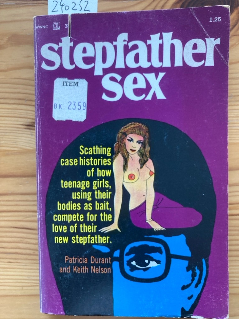 Description: 150p period paperback with purple cover, a tight and clean copy, spine square, no names or stamps, top edge marked by a thin cut (occasionally affecting some text), price sticker, in the back a 12p catalogue of related publications from Connoisseur Publications: "Scathing case histories of how teenage girls, using their bodies as bait, compete for the love of their new stepfather" (cover text)