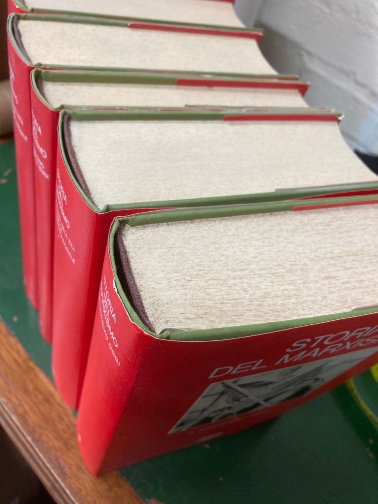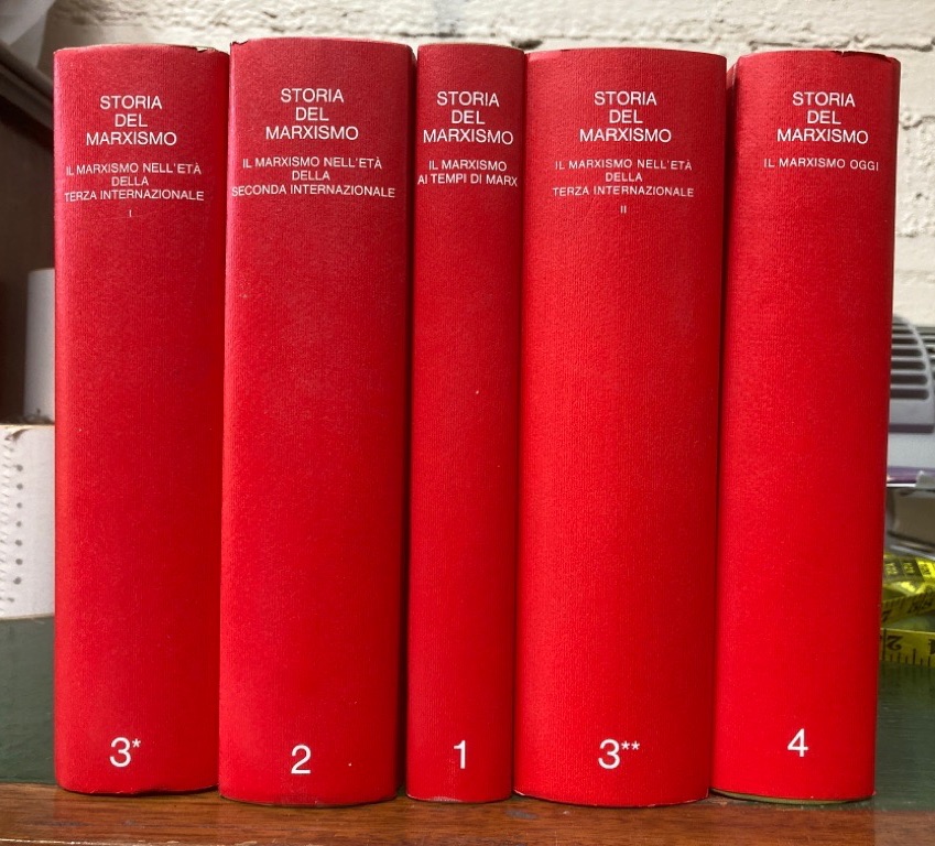 Description: four volumes in five, large hardback tomes with bright red jacket, nice set, well preserved, no names or stamps, initiated by Eric Hobsbawn, Georges Haupt, Franz Marek, Ernesto Ragionieri, Vittorio Strada and Corrado Vivanti, top edge a little dusty, never used set, published between 1978 and 1982, the volumes are entitled 1: Il Marxismo ai tempi di Marx - 2: Il Marxismo nell'eta della Seconda Internazionale - 3, i: Il Marxismo nell'eta della Terza Internazionale. Dalla Rivoluzione d'Ottobre alla crisi del '29 - 3, ii: Il Marxismo nell'eta della Terza Internazionale. Dalla crisi del '29 al XX Congresso. - 4: Il Marxismo Oggi.