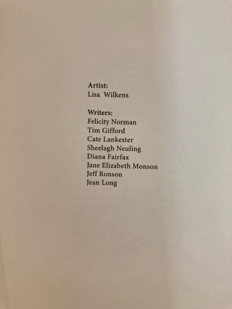 Description: 33p stapled booklet, black card cover, fresh from the digital printing press, book accompanying the exhibition at Plurabelle Books in May 2010 which showed the results of a text-image collaboration of the artist Lisa Wilkens and the creative writing course led by Jane Monson. The writers created stories around the drypoint prints the artist provided. Contributing writers are: Felicity Norman, Tim Gifford, Cate Lancester, Sheelagh Neuling, Diana Fairfax, Jane Elizabeth Monson, Jeff Ronson, Jean Long, limited edition of 100 copies, New