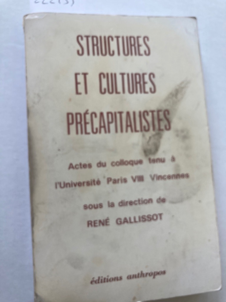 Description: 409p white paperback, brown lettering to front, shelfmark to spine, binding a little slanted, perhaps a few light text markings left by a careful reader. Some soiling to front cover, which extends to a marvelous and magnificent soiling to initial pages and edge. Possibly the effect of the book landing in a puddle on a busy Paris street, the soiling extends over the following pages, attempting to turn into an illustration for the term capitalism used in the title. This book had a mighty accident, in Paris or elsewhere, and the result is quite amazing
