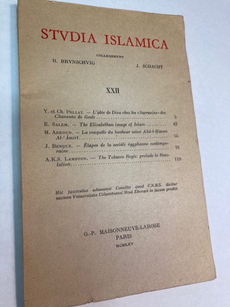 Description: single issue of the journal, very well preserved, un-cut, never read, papers by Pellat (Dieu chez es Sarrasins"), Saklem: Elizabethan image, Berque: Bonheur selon Abu-l-Hasan Al-Amiri Lambton: Tobacco Regie, etc - the essay on Tobacco with extensive pencil markings