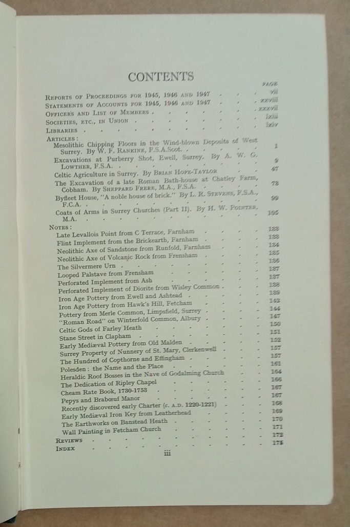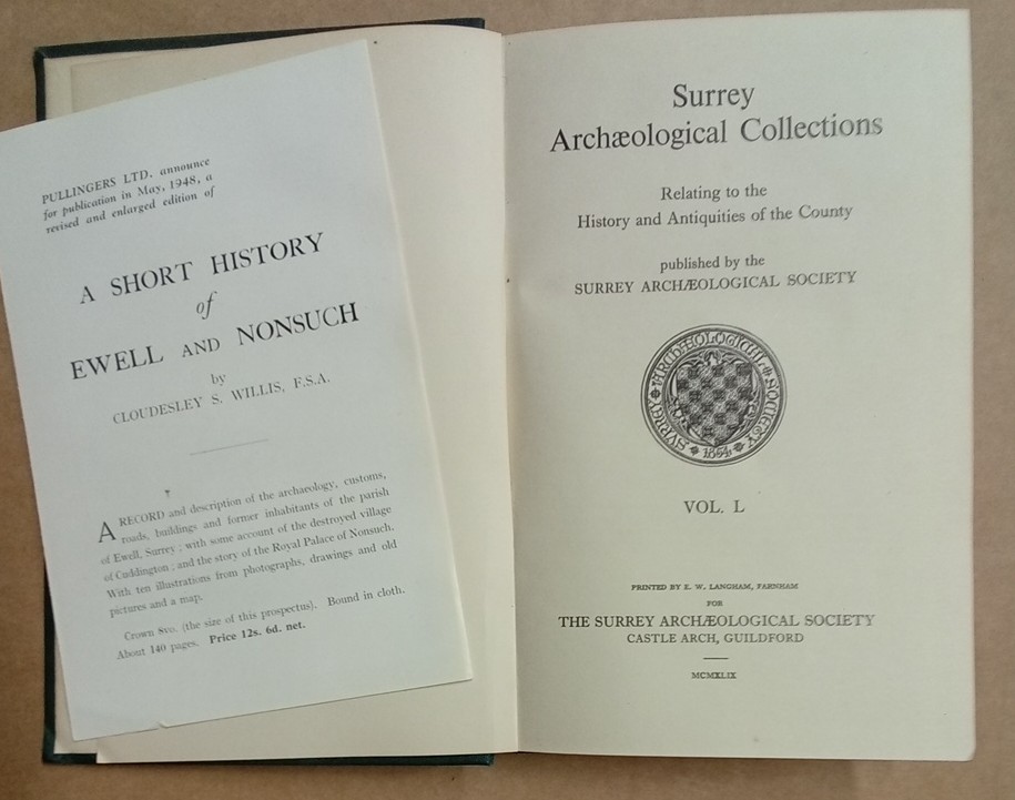 Description: lxiv 185p hardback in dark green cloth, very good condition, gilt seal to cover, minimal wear and binding intact, pages clean and neat, fold-out site chart in excellent condition, includes articles on Celtic agriculture in Surrey and a Roman bathhouse at Cobham, as well as an original flyer and specimen page for the contemporary book 'A Short History of Ewell and Nonsuch'