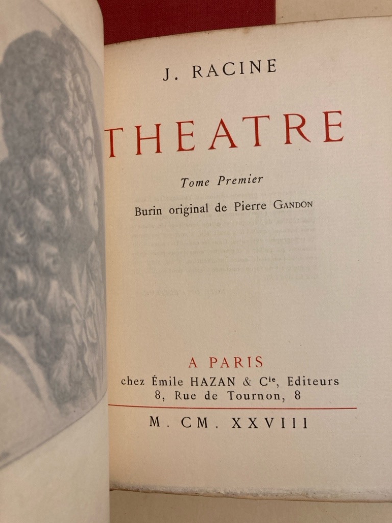 Description: 3 volumes bound in dark brown half morocco with brown marbled boards, spine lettered gilt direct, frontispiece by Gandon with tissue-guard, top edge gilt, one of 1200 numbered copies verge teinte de rives paper, printed with ornaments, original paper wrapper bound in, this set numbered 370, a lovely set, hardly used, they just don't do books like this any more
