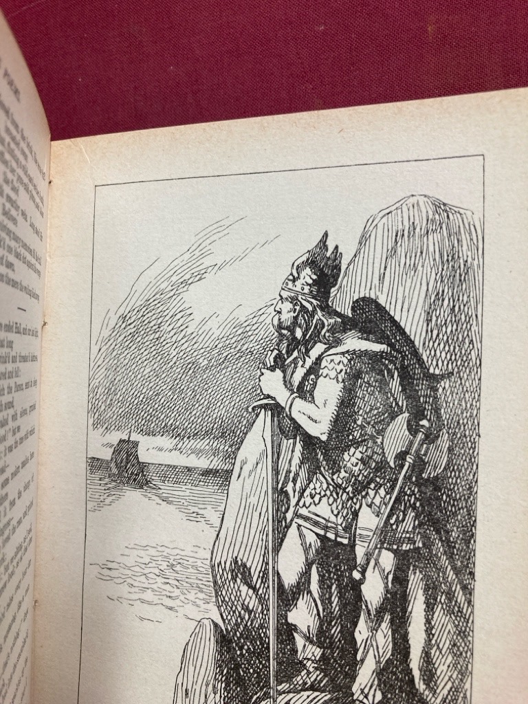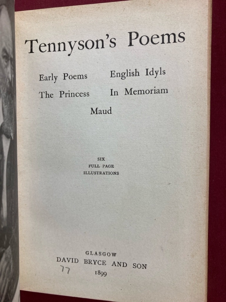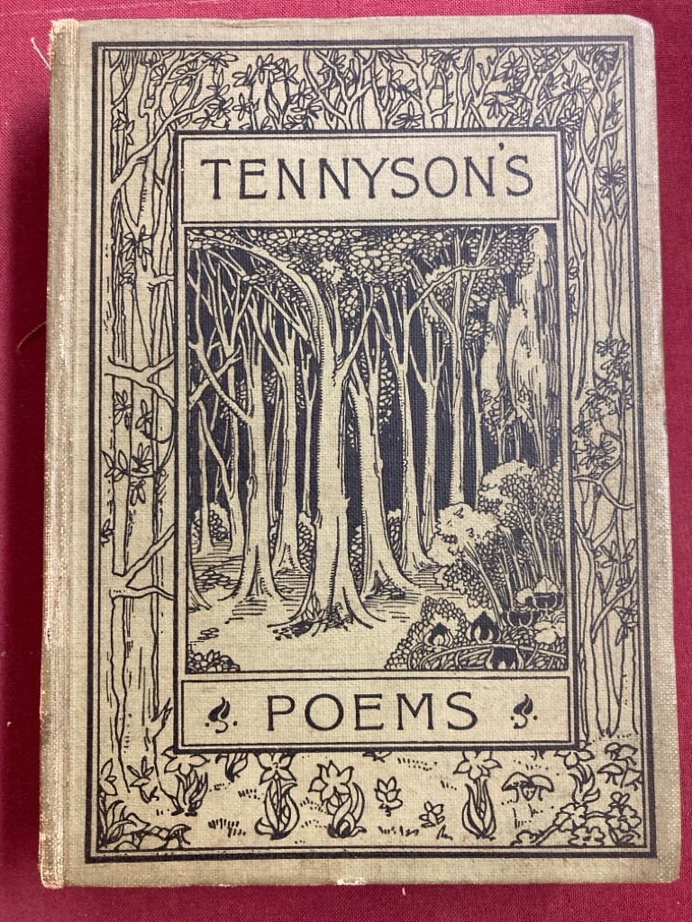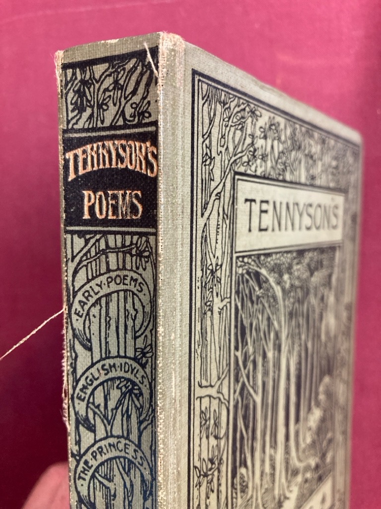 Description: viii 236p thin green cloth boards with striking design to front and spine, book is still square, flat spine (back hinge one thread loose), plates, name in pencil to front, paper yellowing, binding collectable, Idylls spelled "Idyls" on title and spine