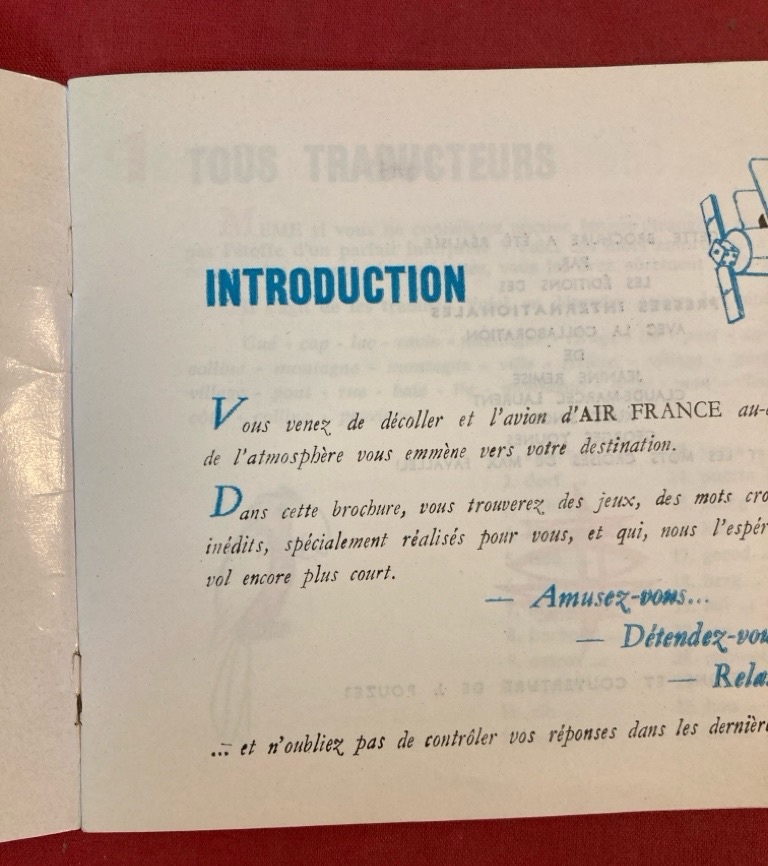 Description: 28p oblong format, stapled, illustrated in colour, with a section "seriez-vous un bon agent secret?", advertisement for Gitanes and Fontenoy cigarettes, to while away the time on board a Air France airplane