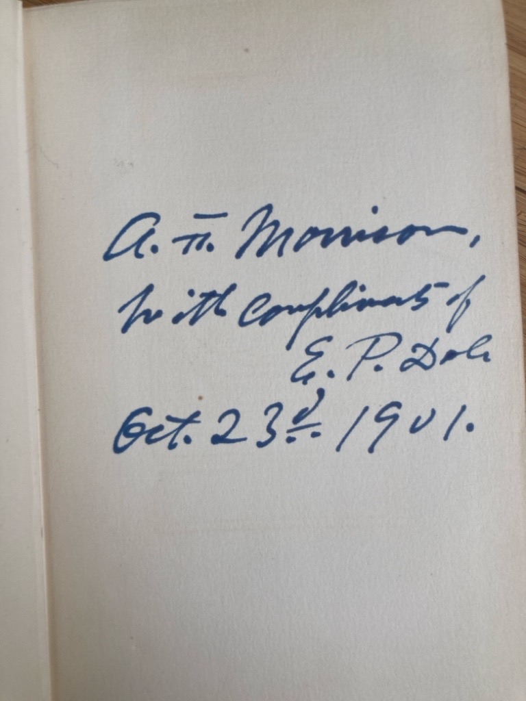 Description: 228p original blue cloth binding with gilt lettering to front, light library markings, fresh copy, author inscription to endpaper dated 1901, tight and clean, uncommon title