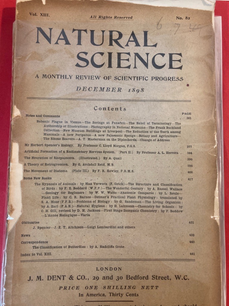 Description: 10p essay in "Natural Science", contains also lively Notes and Comments, News, Obituaries, New Books, Bubonic Plague in Vienna, Borings at Funafuti, Authorship of Illustrations, Photography in Museums, Frank Buckland Collection, Mr Spencer's Biology by Lloyd Morgan, Neuration of Rhopalocera by A Quail, approx 86p, grey paper cover, first edition, spine fragile, well preserved