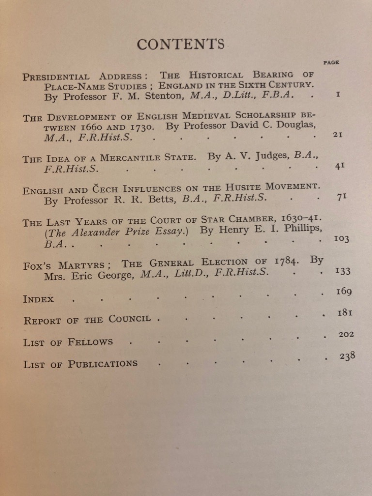 Description: 255p fresh green cloth, gilt highlights, gilt arms to front, excellent fresh copy, some pencil marks: Place Name Studies, Mercantile State, Hussite Movement, Star Chamber, Fox's Martyrs, etc