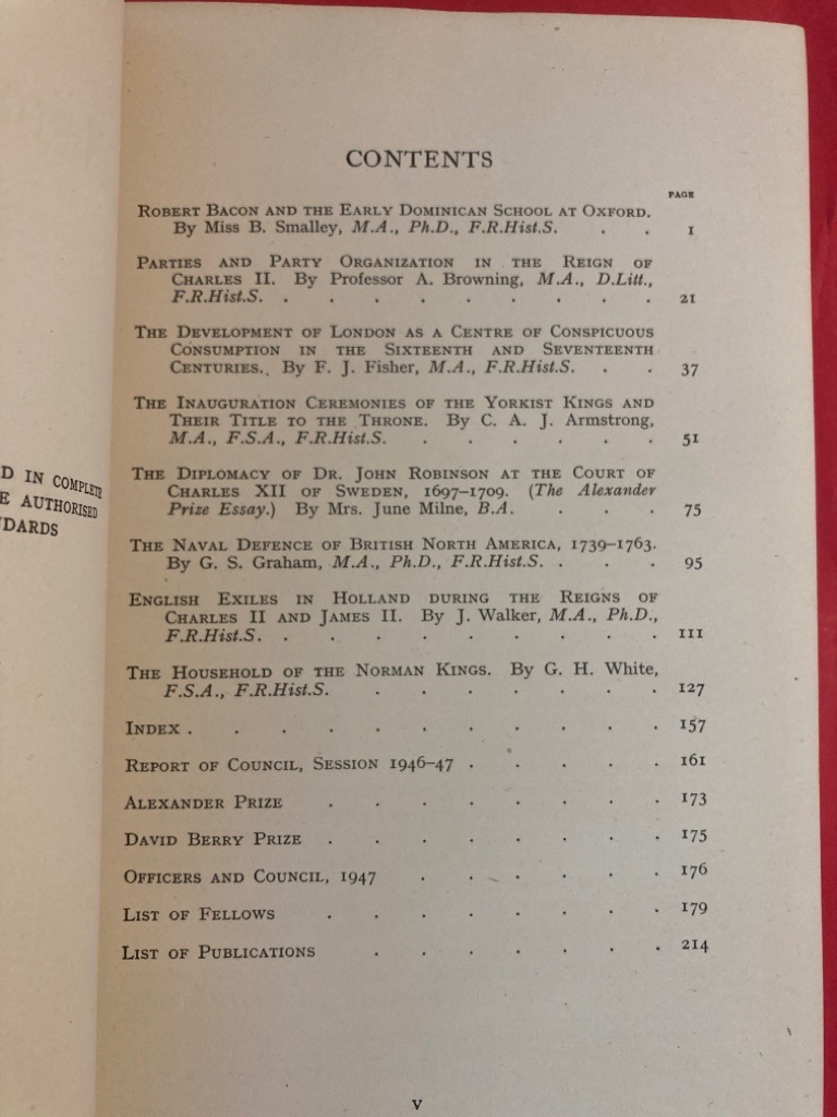 Description: 231p fresh green cloth, gilt highlights, gilt arms to front, excellent fresh copy: Robert Bacon and Dominican School, Conspicious Consumption in the 16th Century in London, Yorkist Kings, Naval Defence of British North American 1739 - 1763, Exiles in Holland, etc
