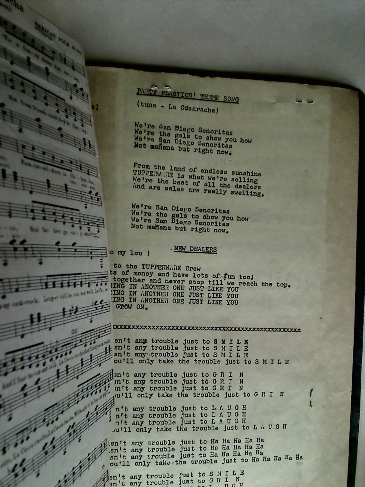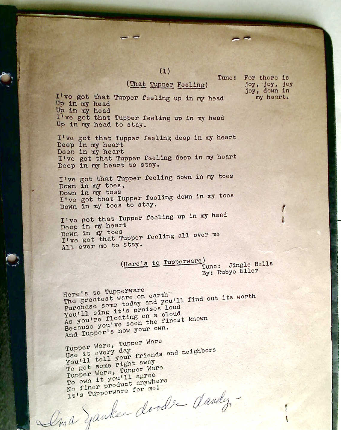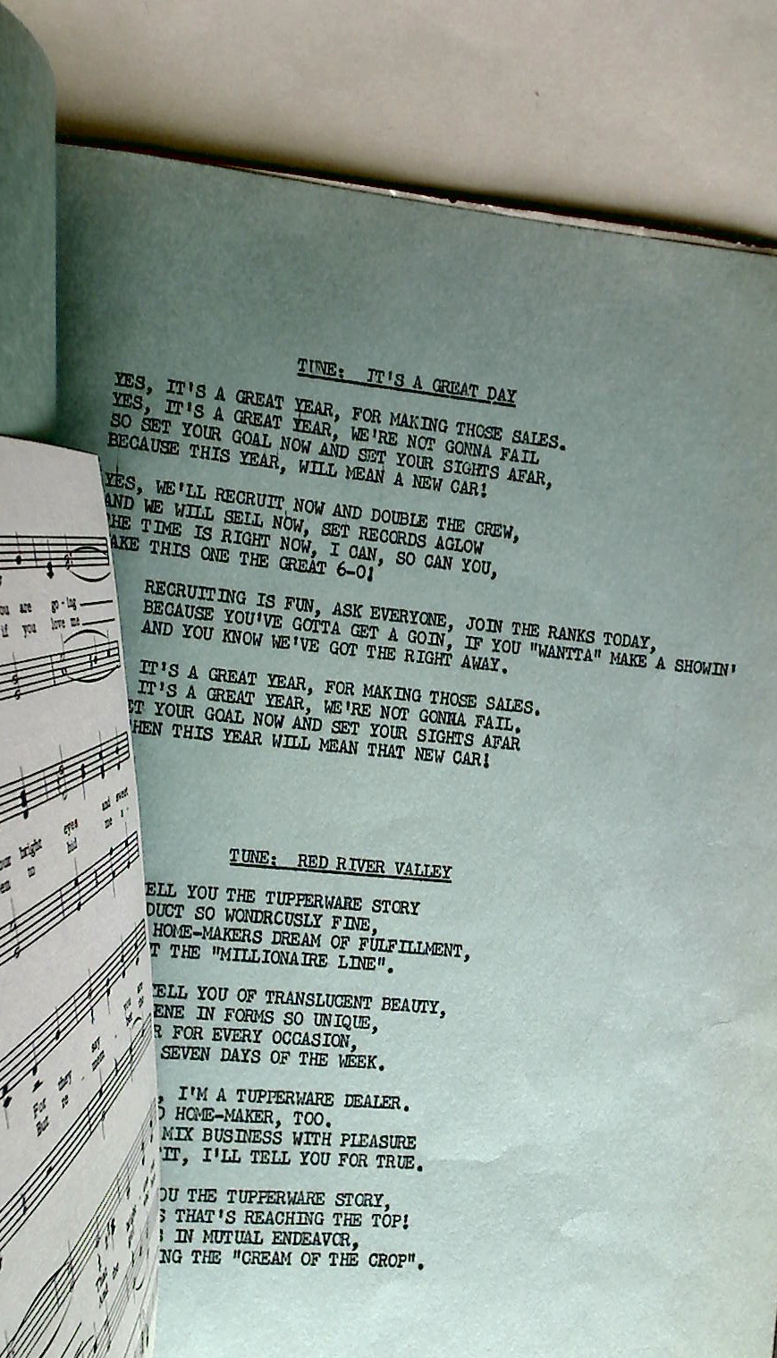 Description: this is a plain old folder with ten mimeographed sheets (of different colour) with the text for Tupperware songs on rectos, some musical tunes stapled to versos, dated from a Happy Birthday song which references Eight Years of THP (Tupperware Home Parties). Includes That Tupper Feeling, Here's to Tupperware, Party Plastics Theme Song, New Dealer, Put on your Old Grey Bonnet, Roll Out the Barrel, April Showers, We are the Tupper Demostrators, etc, some songs specify lines for dealer and managers, very original item, a little aged, still well preserved