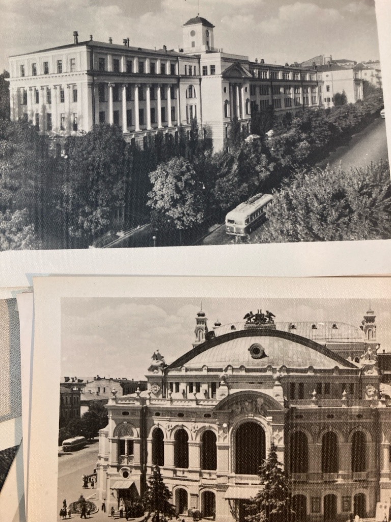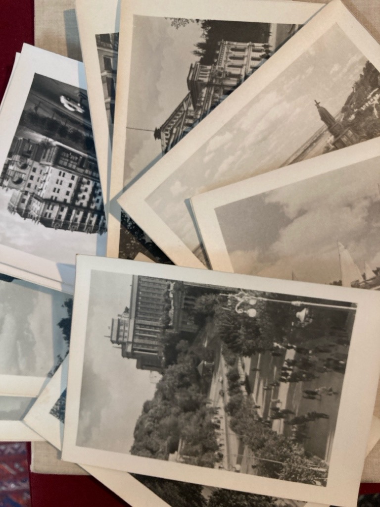 Description: cloth folder with approx 20 period postcards of Ukrainian sights loosely inserted, well preserved, note in ink dated 1953