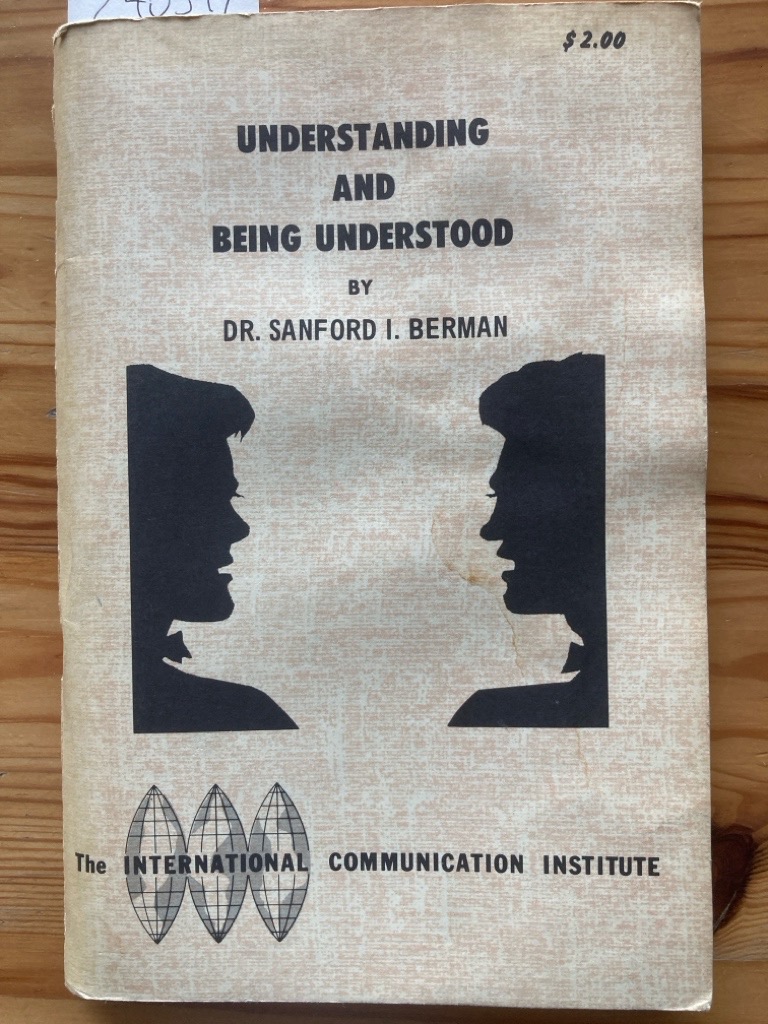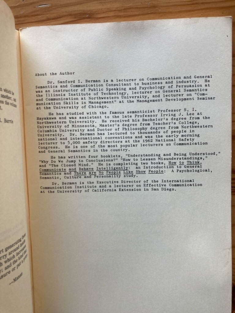 Description: vi 72p stapled paperback, illustrated cover with two face profiles, cover of brown tint, clean copy, one page with yellow highlighting detected, fresh copy, uncommon title, text reproduced from typescript, General Semantics related treatise, dedicated to Irving Lee