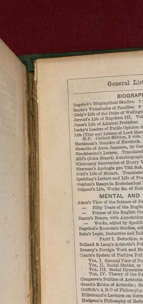 Description: 487p bright green cloth with gilt lettering in black frame to front, publisher's "Longman's Paternoster Row" emblem to front, "Why then the world's mine oyster" to title page, a tight and firm copy with square spine, only fault is that the first page of a twelve page publisher's catalogue bound in the back has been removed, no year of publication.