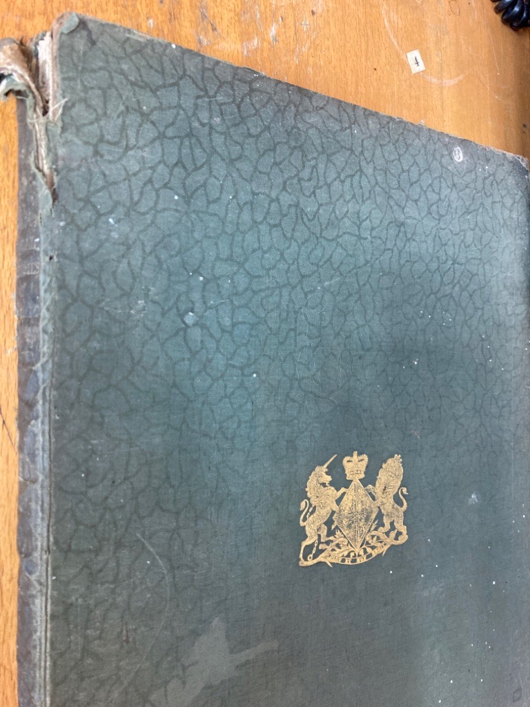 Description: 121p large format hardback in original dark green cloth with gilt arms to front and back "Dieu et mon Droit", spine tearing, book-block fully detached, binding yielding, all edges gilt, printed from engraved plates on strong paper, note to subscribers at beginning dated 1838, a somewhat ruined copy of the third volume, decorative title page, needing a bit of help from the bookbinder