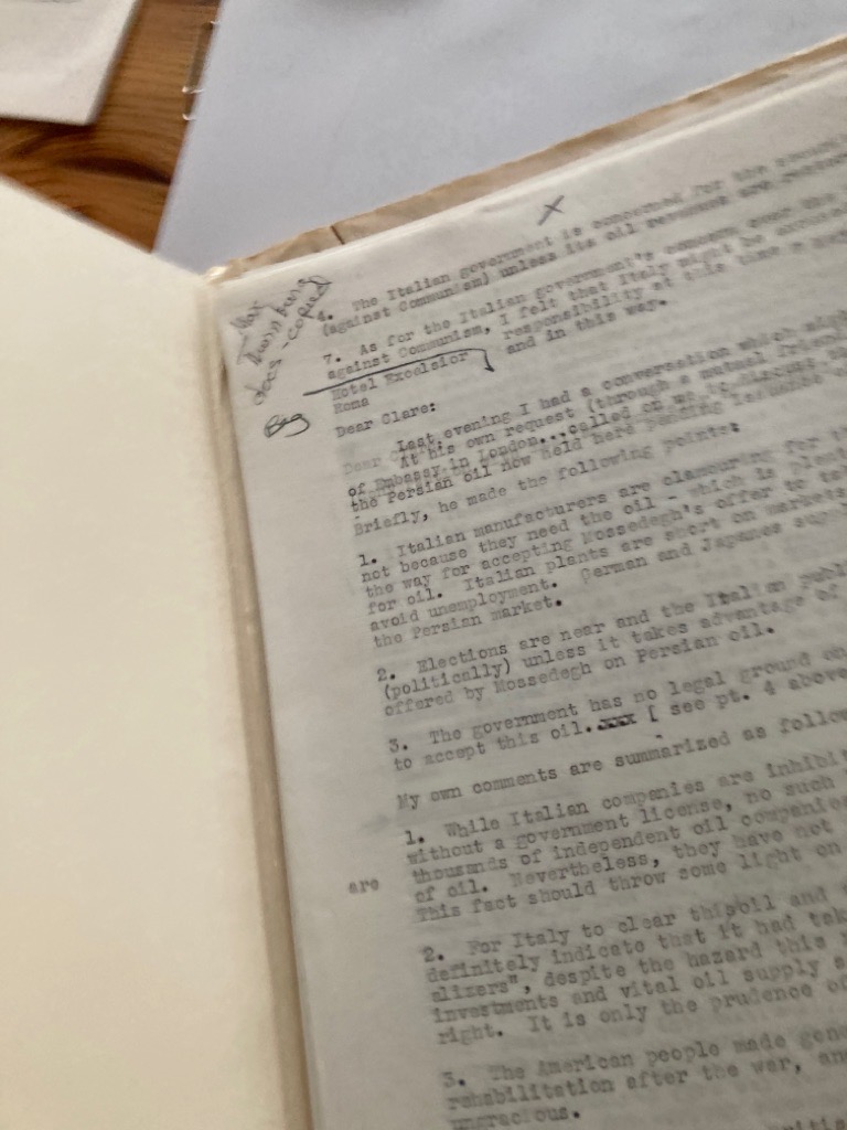 Description: This is a collection 16 typewritten pages (approx 1960ies) single spaced, giving extracts of originals, with titles like: Notes from Discussion with Dean Acheson (1951), MWT letter to Admiral Rufus Rose (1951), Letter to Loy Henderson US Ambassador Tehran (1951), Transcript from Personal Journal, An Appraisal of the Political Situation in Iran, 30 May 1950, Memorandum of Conversation with Gene Black (1951), Letter to Ambassador John Wiley, 1948, Letter about Italian interests (Dear Clare); Statement of MWT on behalf of OCI, Radiogram Sep 1951 to Averill Harriman, also a 6 page Memorandum of conversation with Ebtenhaj, Bank Melli 1947. It seems the material was created with access to the originals, these are not originals, except possibly for the Bank Melli conversation item. Thornburg was an American petroleum executive and government adviser