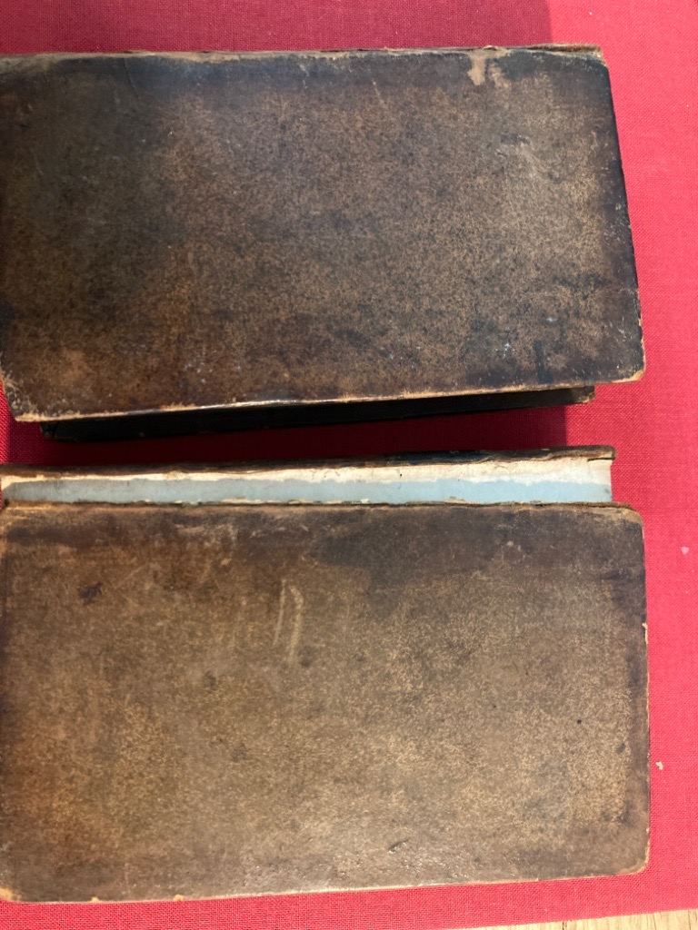 Description: 499p 456p small format, brown leather, front board of volume 1 detached but present, both volumes with ink writing and name stamp to front endpapers, both volumes have a beautifully engraved frontispiece and title plate, binding apart from detached front board very firm, overall good condition