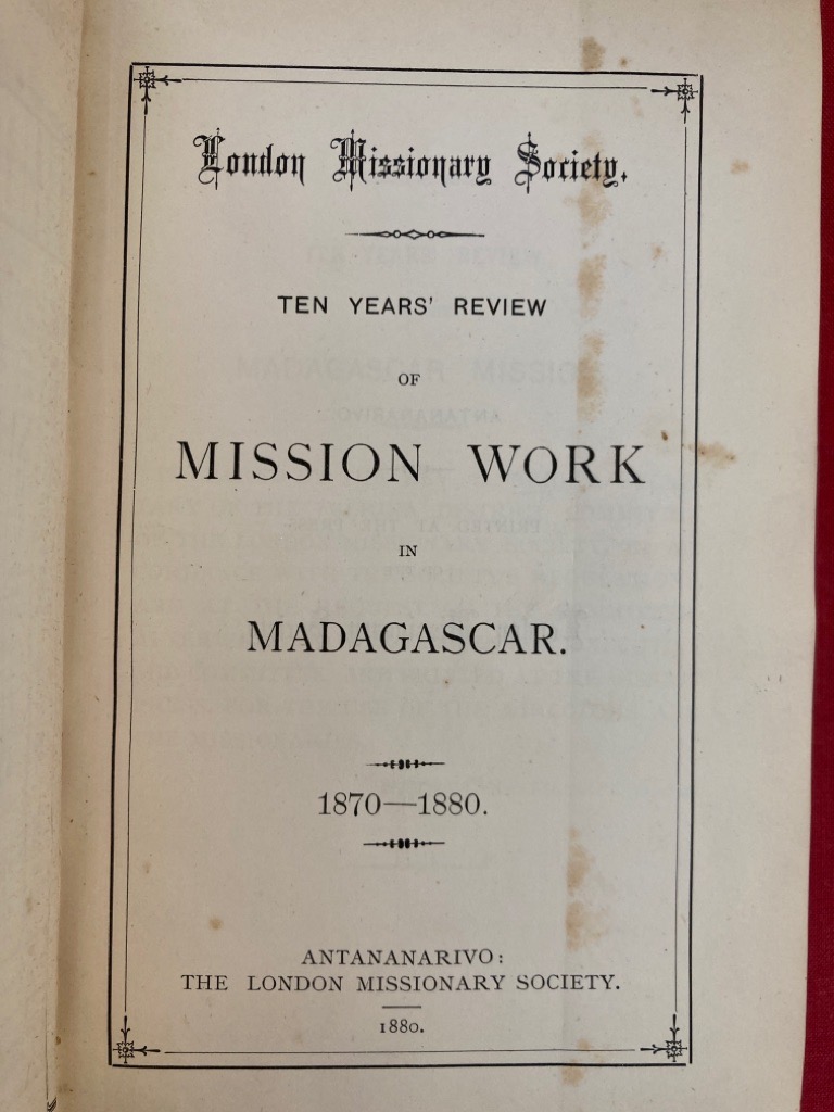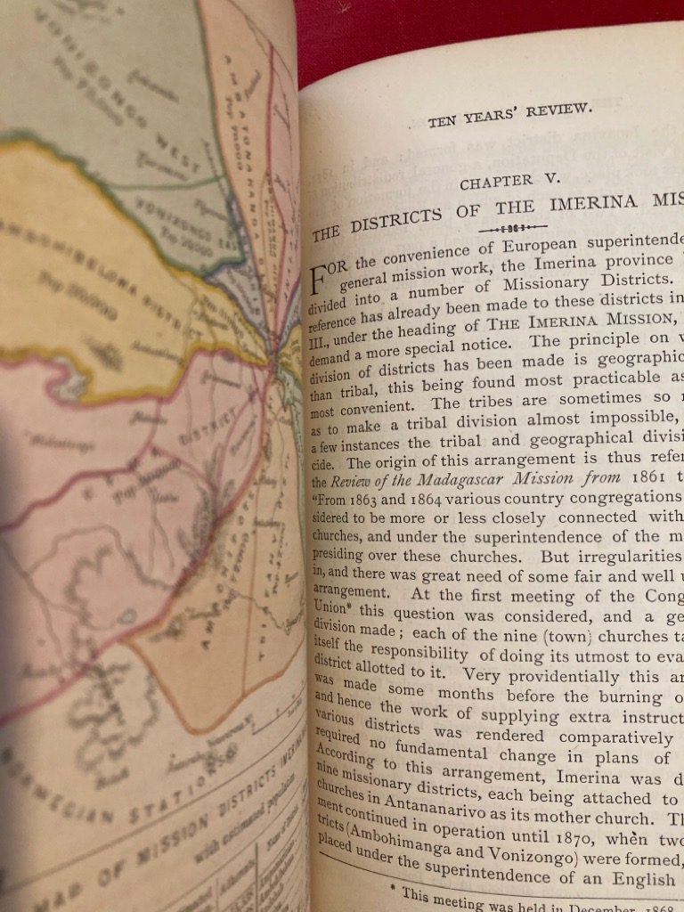 Description: viii 319p hardback brown cloth with leather label to spine, fold-out statistics table as frontispiece, fold-out colour map of Madagascar, colour map of missionary districts, library bookplates, donation bookplate, errata slip bound at rear, in excellent condition