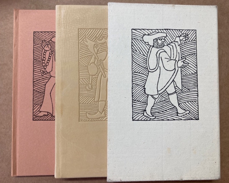 Description: 64p 50p small format hardbacks in card slipcase, tan and beige covers, very good condition, a little light wear to slipcase, both volumes like new, pages clean and bright, text and woodcut artwork very clear and sharp, small ink stamp to title page, excellent copy of an uncommon facsimile edition (ISBN: 3855771448)